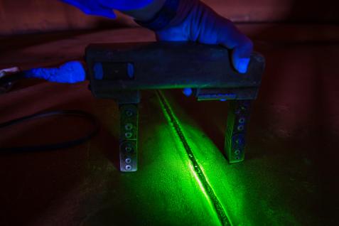 In addition to fluorescent magnetic particle testing with the aid of UV lamps, magnetic particle testing can also be carried out in daylight. Colored, usually black magnetic particles are used here. Sufficient contrast is achieved by first applying a white contrast paint.