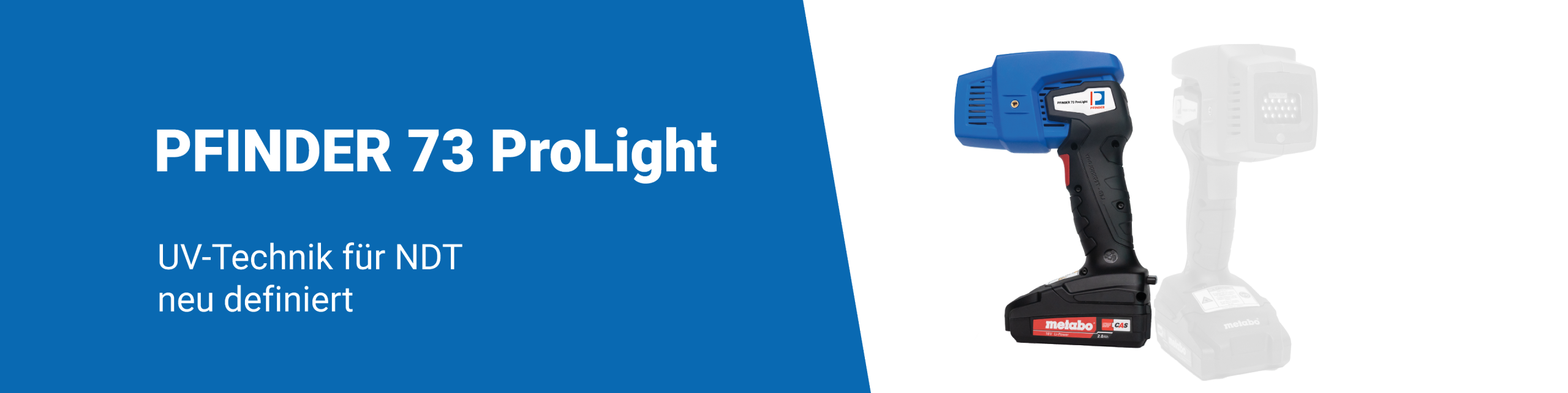 PFINDER 73 ProLight ist ein UV-Handstrahler auf Basis von LED-Technik zur Inspektion von Prüfergebnissen unter UV-Strahlung bei der fluoreszierenden Magnetpulver- und Eindringprüfung.